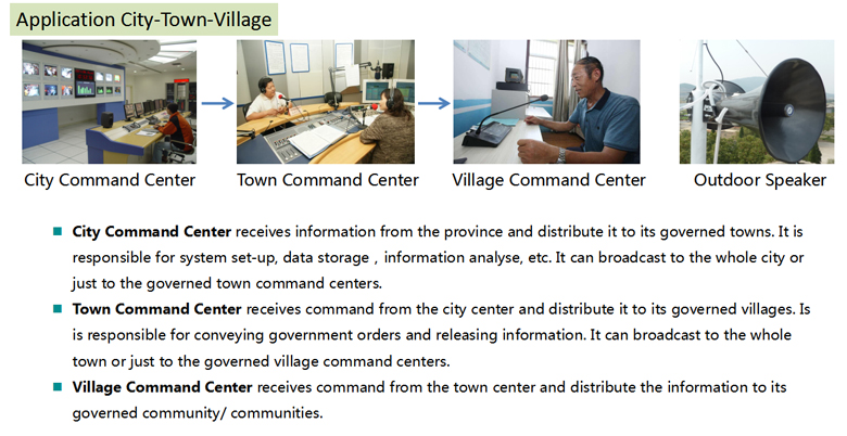 Local instant broadcast means that when receiving early warning information and emergency notifications from the higher level, the county and town levels can select different levels to insert such information in the local broadcast control center according to the range of early warning and notification.