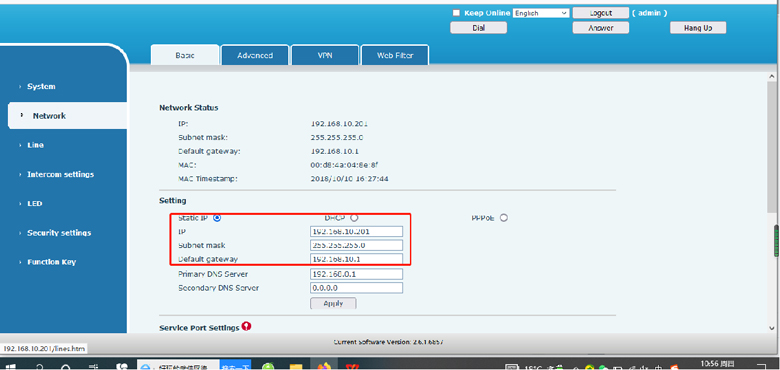 After logging in, you can modify the IP address, (the IP address needs to be on the same network segment as the SIP server).