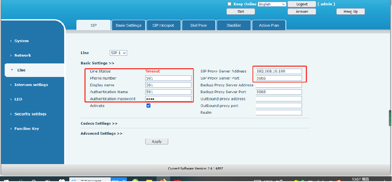 Enter the SIP account number, password, server IP, port, and so on as follows: