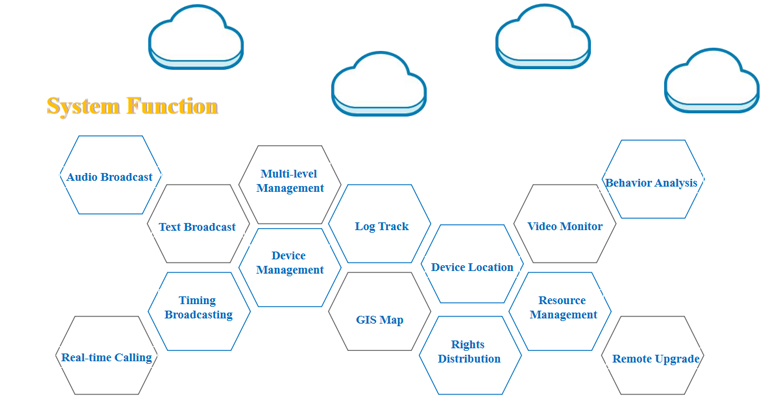 Servers can be deployed in the cloud/locally to provide broadcast system services. The terminal can be connected to the system via the operator’s 4G/5G mobile network for signal transmission. Each management center (sub-control center) can achieve multi-level broadcast and on-demand functions through platform, mobile app, microphone, etc.